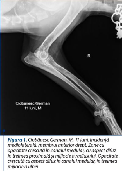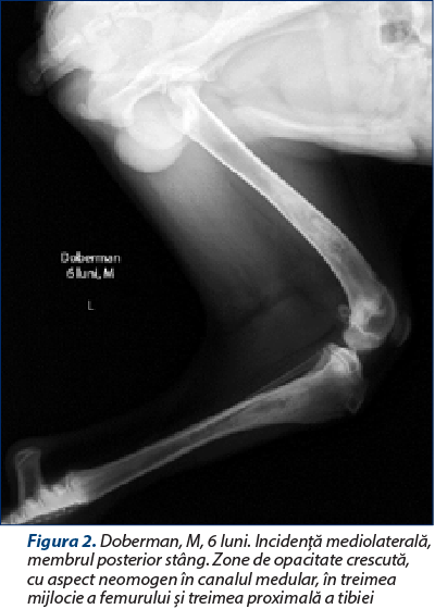 Modificările radiografice se prezintă într-o gamă variată de semne, în funcţie de momentul evolutiv al bolii. Boala prezintă trei faze (una precoce, una mijlocie şi una tardivă), din care prima fază este greu de surprins radiografic (Pollard şi Phillips, 2018; Kieves, 2021). Deşi poate afecta orice parte a diafizei unui os lung, de cele mai multe ori procesul debutează în apropierea orificiului arterei nutritive diafizare. Semnul iniţial este reprezentat de o scădere a opacităţii canalului medular în jurul orificiului arterei nutritive a osului (faza 1). Apoi, se produce o creştere focală a opacităţii endostului, rezultând zone bine delimitate în canalul medular, cu opacitate similară corticalei diafizare. Pe măsură ce boala evoluează, leziunile osoase progresează, focarele cu opacitate crescută fuzionează, transformându-se în focare cu aspect neuniform, difuz, cu tendinţă de extindere pe o zonă cât mai mare din canalul medular diafizar (faza a doua) (figurile 1 şi 2). Periostul din apropierea zonelor afectate poate deveni evident, constatându-se o reacţie periostală omogenă, fenomen observat la 15-50% din cazuri (Trostel şi col., 2003; Kieves, 2021). Ulterior, se constată că zonele din canalul medular îşi diminuează opacitatea şi dispar, astfel că, din punct de vedere radiografic, osul îşi recapătă aspectul iniţial (faza a treia) (Tudor şi Vlăgioiu, 2015). Examenul radiografic este necesar atât pentru confirmarea diagnosticului, cât şi pentru excluderea altor afecţiuni osteoarticulare. Diagnosticul diferenţial se face cu alte osteopatii ale tineretului, caracterizate prin şchiopătură şi sensibilitate osoasă, cum ar fi osteodistrofia hipertrofică, hiperparatiroidismul secundar nutriţional, rahitismul, osteomielita etc.