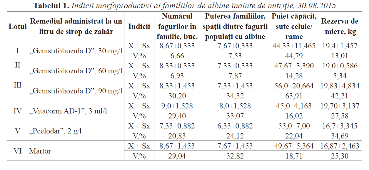 ml/l. Cele din lotul V au primit „Pcelodar” – 2 g/l, iar cele din lotul VI (martor) – sirop de zahăr pur.