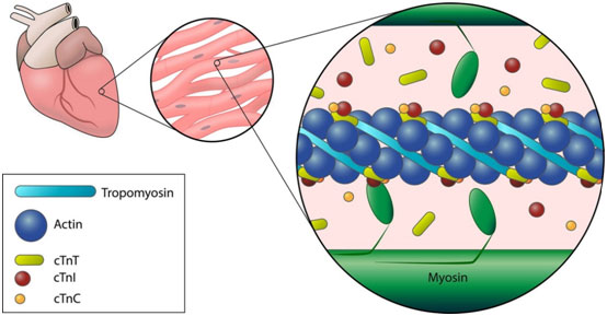 Тропонины — это регуляторные белки, участвующие в мышечном сокращении. Существует 3 вида тропонинов: сТnI, сТnT и сТnC, каждый из которых несёт свою функцию. Поперечнополосатая мышечная ткань состоит из двух белковых нитей — актина и миозина. Тропонины находятся на тонкой нити — актине, где функционируют как «ключик», связываясь с кальцием, они дают возможность произойти мышечному сокращению.